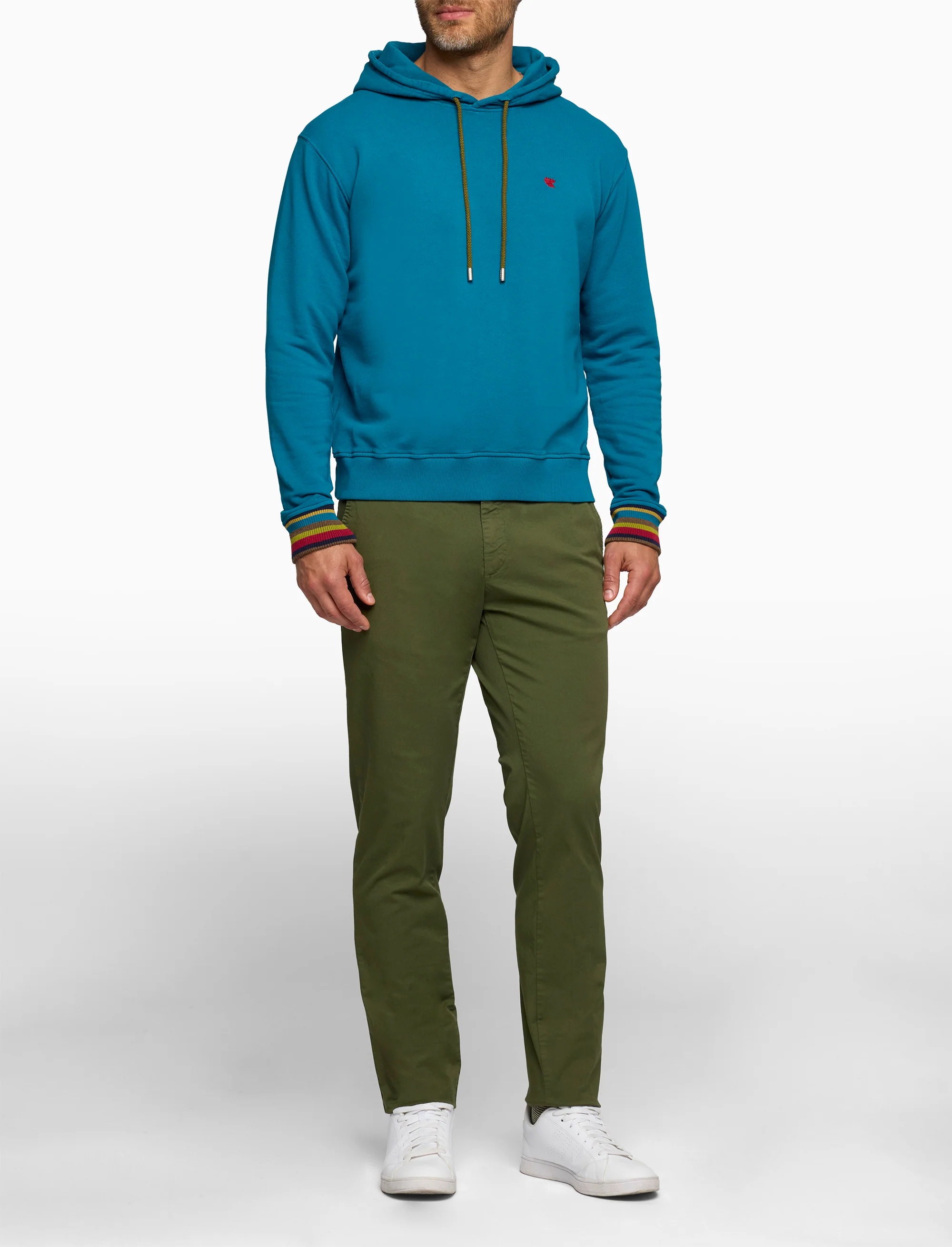 Felpa con cappuccio unisex, realizzata in pregiato cotone tinto in capo, in un raffinato color pavone, arricchita da eleganti inserti multicolor che richiamano la tradizione dell'artigianato. Un capo che esprime una sobria eleganza, perfetto per un guardaroba contemporaneo e distintivo. La sua essenza risiede nella qualità dei materiali e nella cura dei dettagli, riflettendo l'impegno di GALLO per l'eccellenza. Realizzate in Italia, sinonimo di qualità ed eccellenza GALLO.